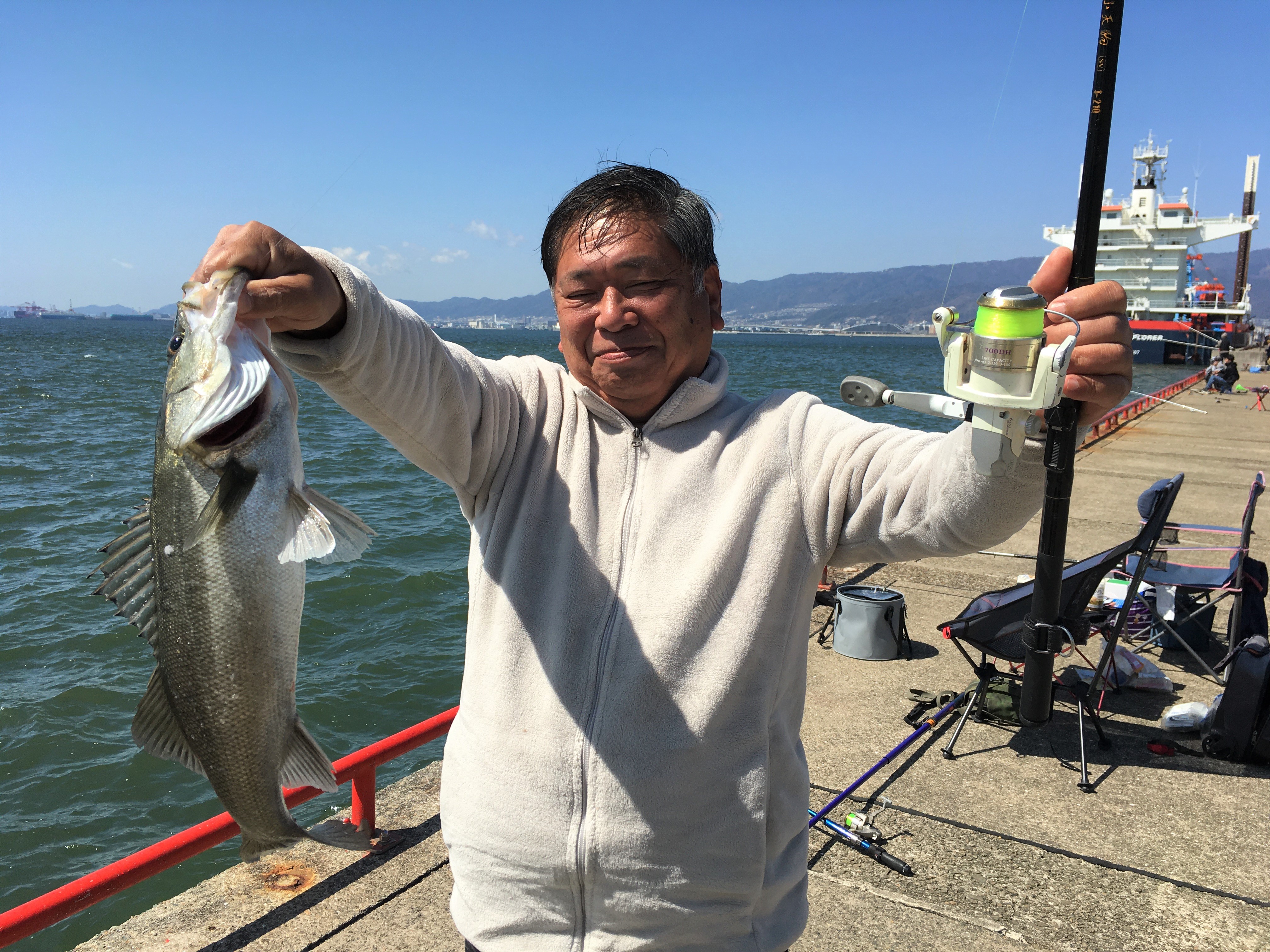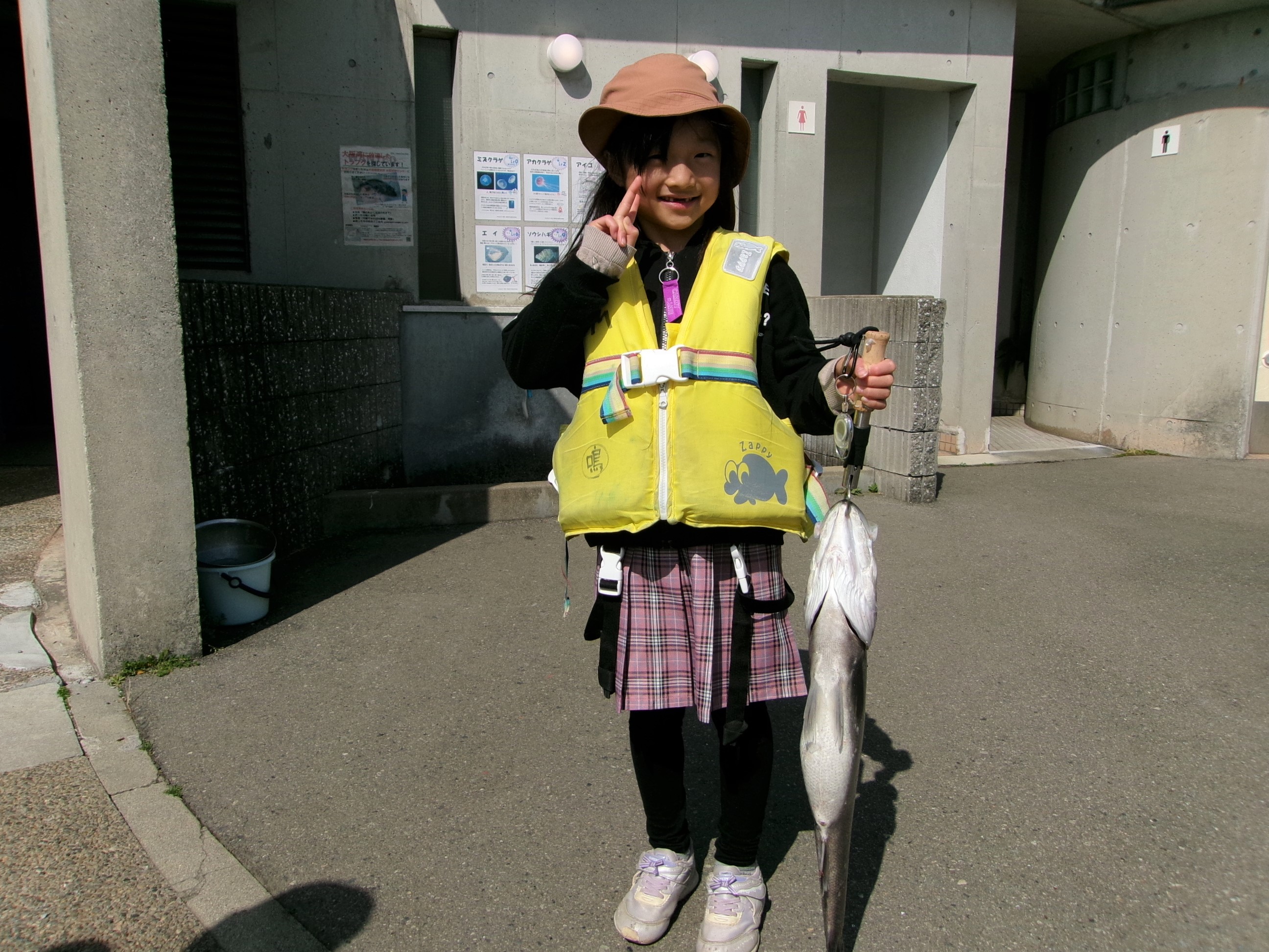 陽射しがあり暖かい海づり広場に、ご家族連れの方が数十名来られています。ただサビキ釣りでの釣果はほとんどなく、子供さん達は暇をもてあそんでいるようです。9時半頃に、東側でハネの43cm(エビ撒き釣り)が上がっていました。11時位から風向きが北から南向きに変わり向かい風となって釣りづらい中、管理棟前でエビ撒き釣り(ブッコミ)をされている方が49cmのハネを上げられました。14時頃、チヌの47.5cmエビ撒き釣り(ズボ)で上がりました。