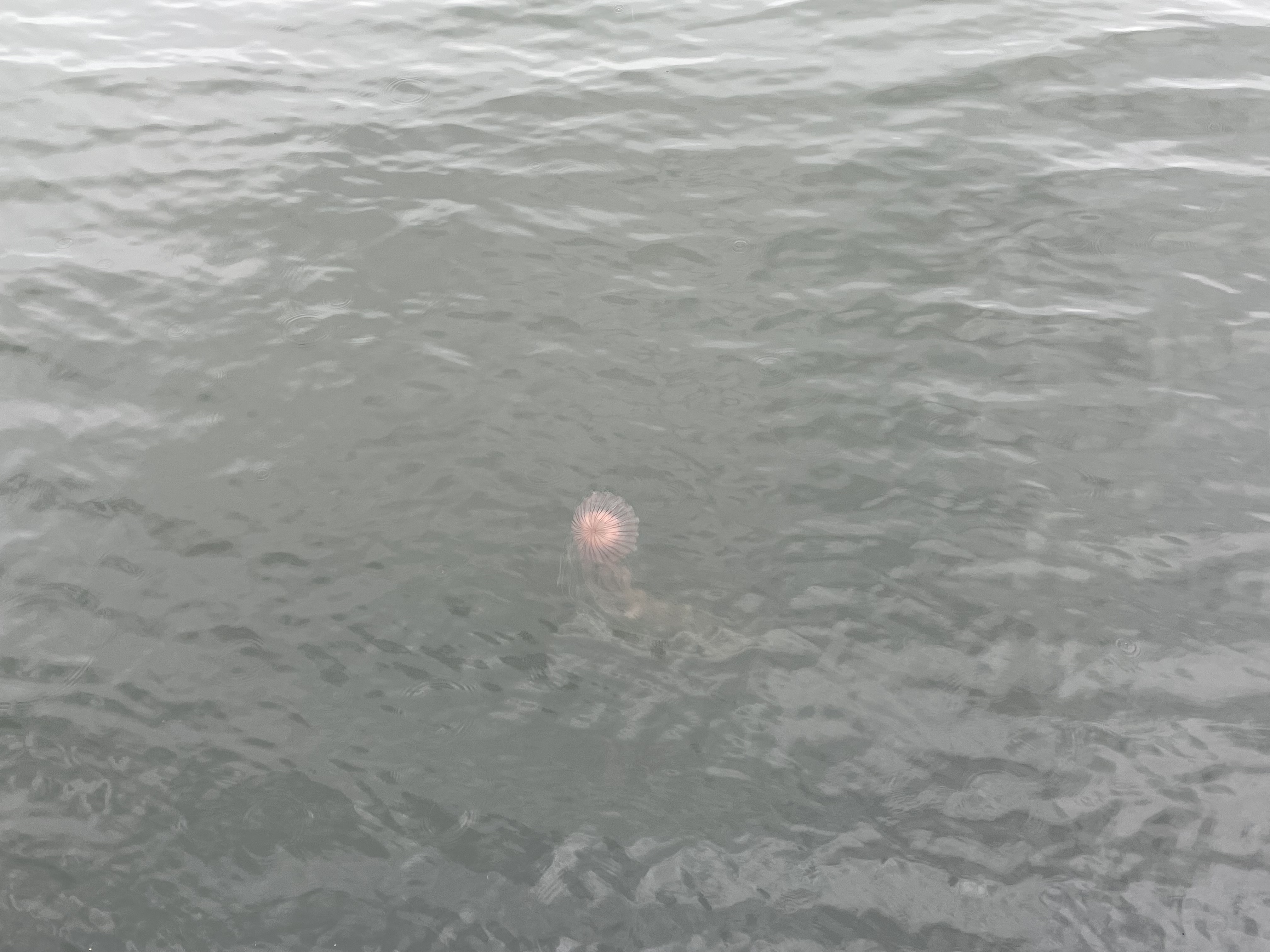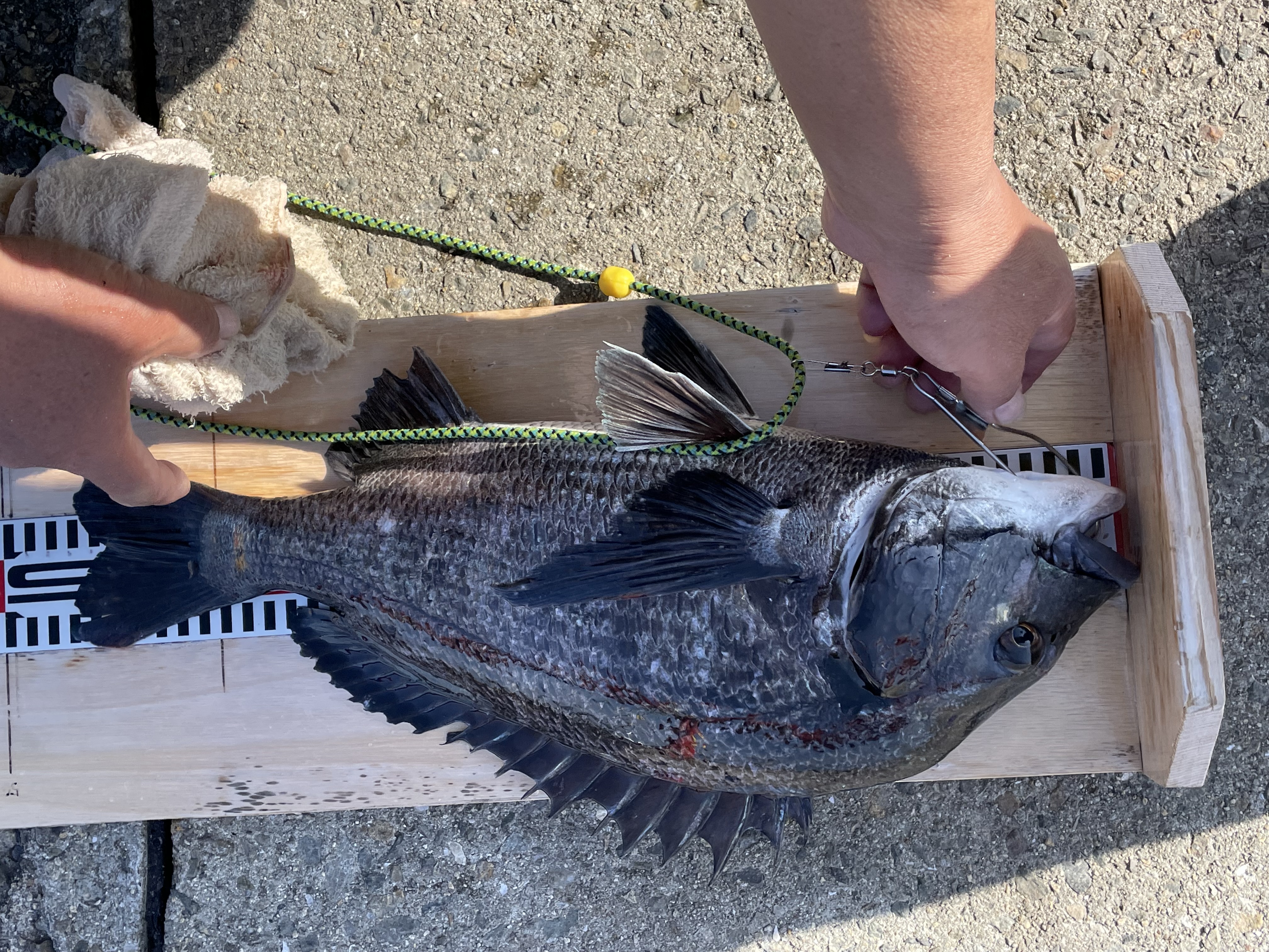 午前10時半頃、雨が止んだタイミングで、チヌ(50.0cm)が上がりました。シラサエビを使ったウキ釣りで、タナは2ヒロ半から3ヒロの間位だそうです。