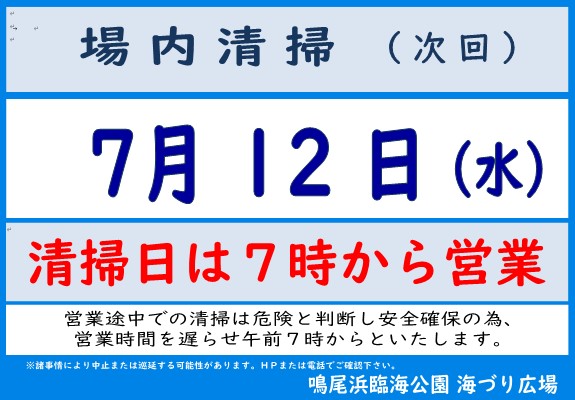 明日、7月12日は清掃日です。開園時間が午前7時からとなりますので、お間違えの無いようお願いします。また、並び位置も普段とは異なりますので、係員の指示に従って下さい。