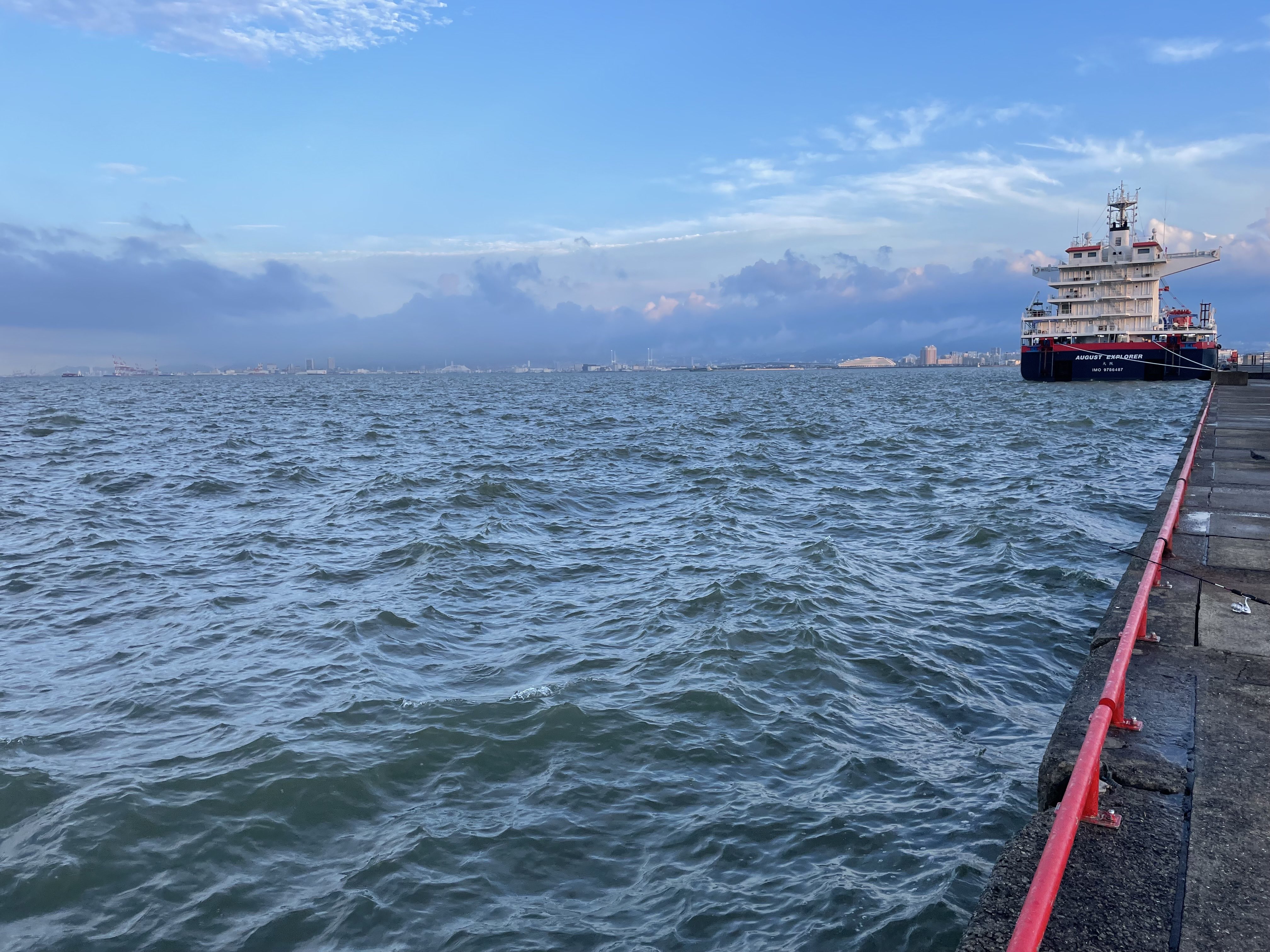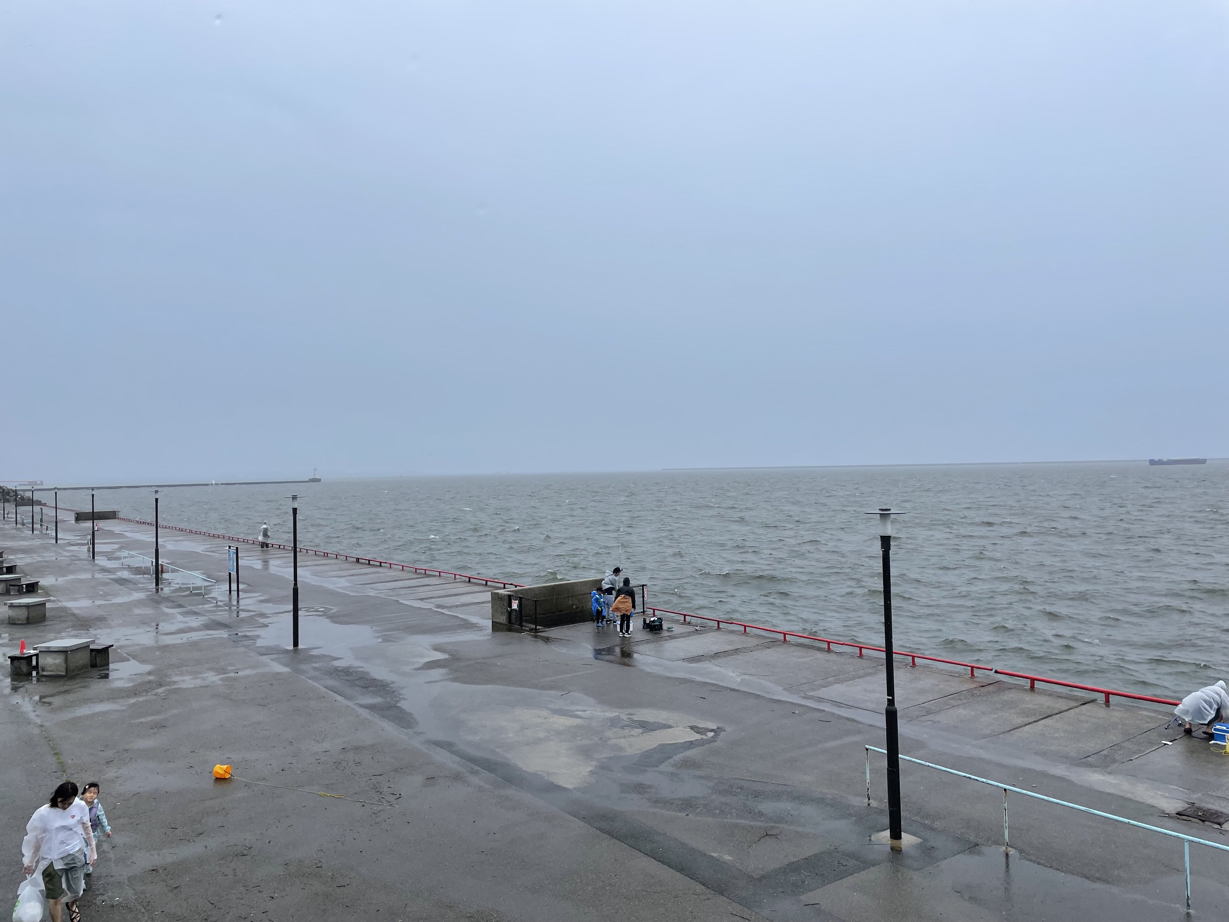 昨日の雨の影響で、海は大変濁っています。川から流れてきたであろう草や小枝などのゴミも多く、岸壁に漂着しているため短い竿ではゴミが引っ掛かり釣りづらそうです。竿は長めの物の方が良いでしょう。