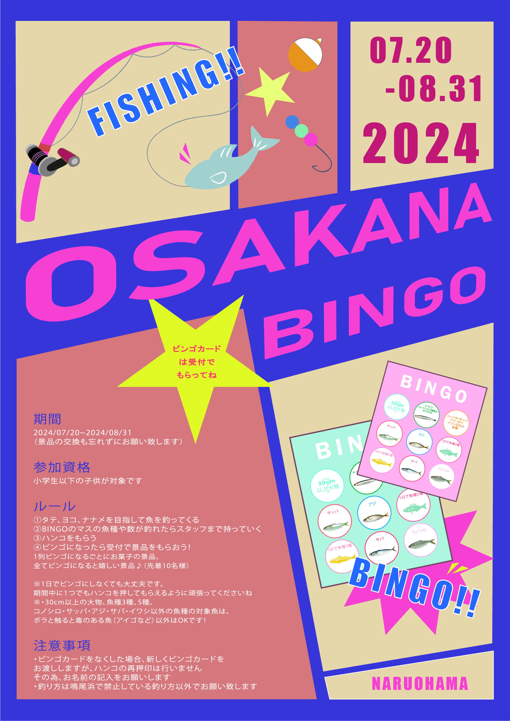 毎年恒例、魚拓イベントおこないますよ、と。夏に向けておさかなBINGOやサビキ釣り大会、魚拓体験とイベント盛りだくさんとなっております。