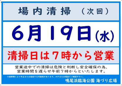 清掃中は、清掃車と高圧洗浄機車が場内に乗り入れ、釣り場全面の清掃を行うため、営業途中での清掃は危険と判断し安全確保の為、清掃日は営業時間を遅らせ午前7時からとなります。くれぐれもお間違いがないようにお気を付け下さい。