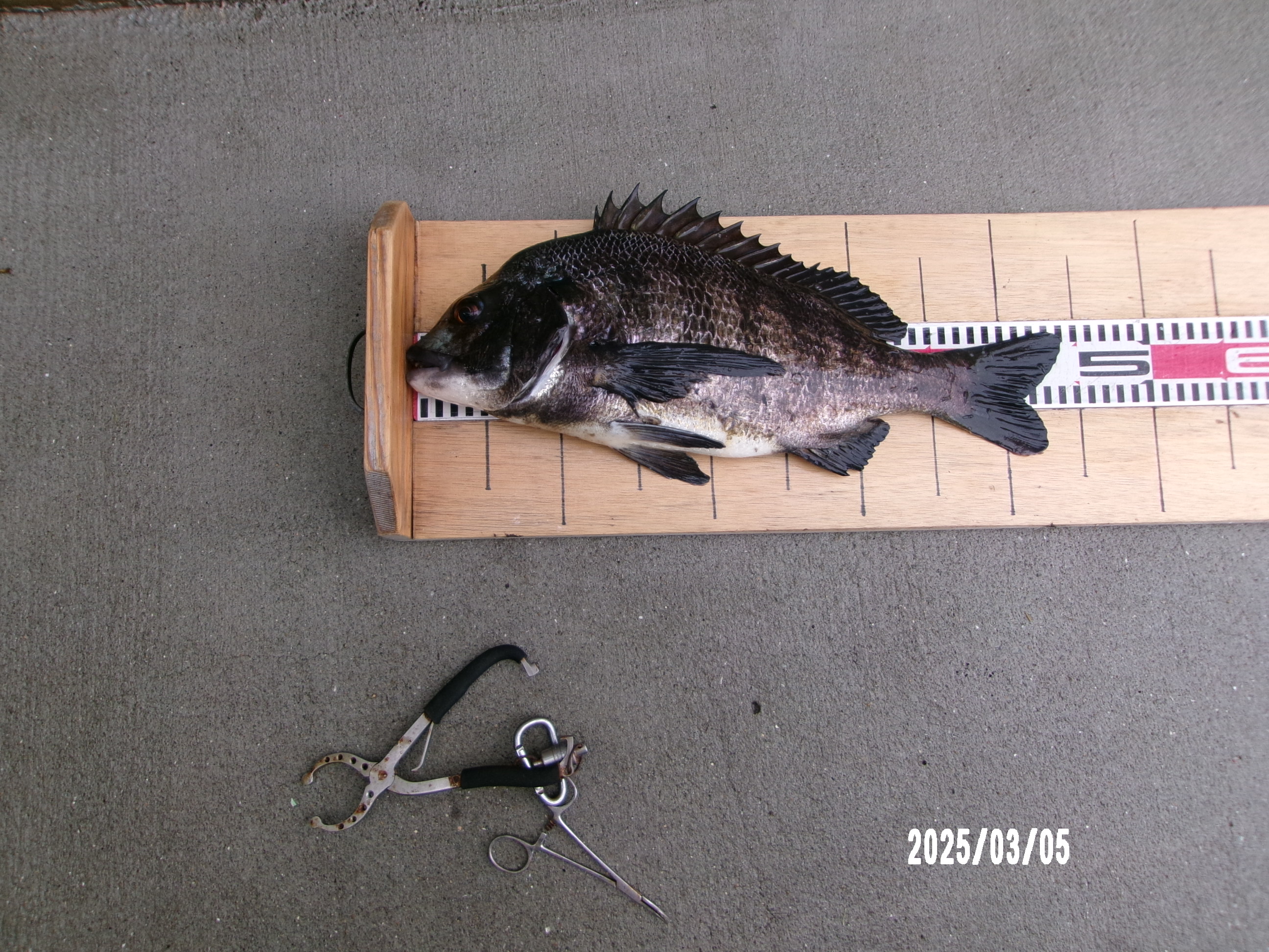 15時40分過ぎ東側でチヌ44cm(餌、オキアミ)を釣られました。 -