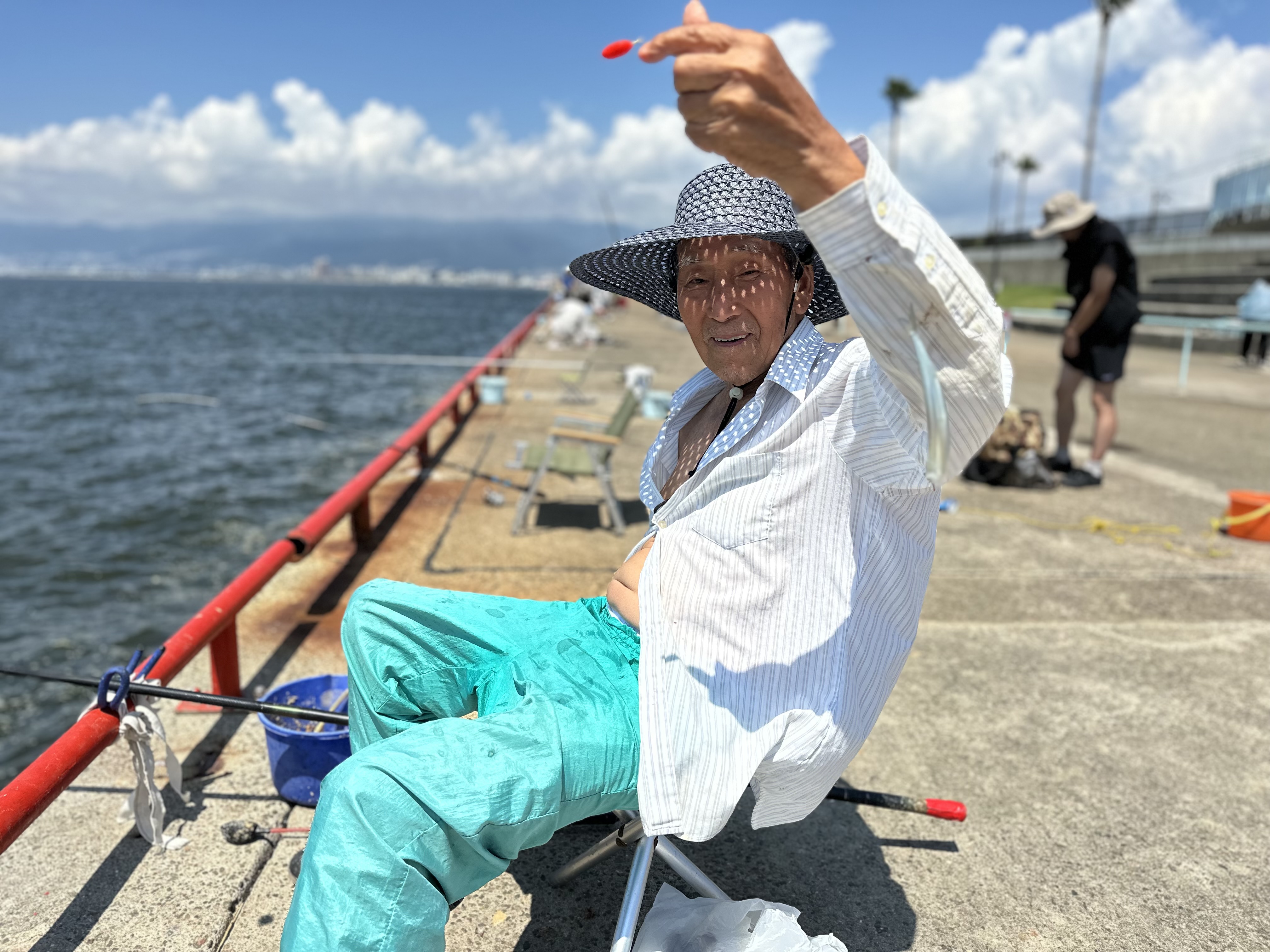午後2時半現在、南の風1.5m、快晴、34℃。風が吹くとチョットましですが陽射し強烈。カタクチイワシと少しサッパが上がっております。