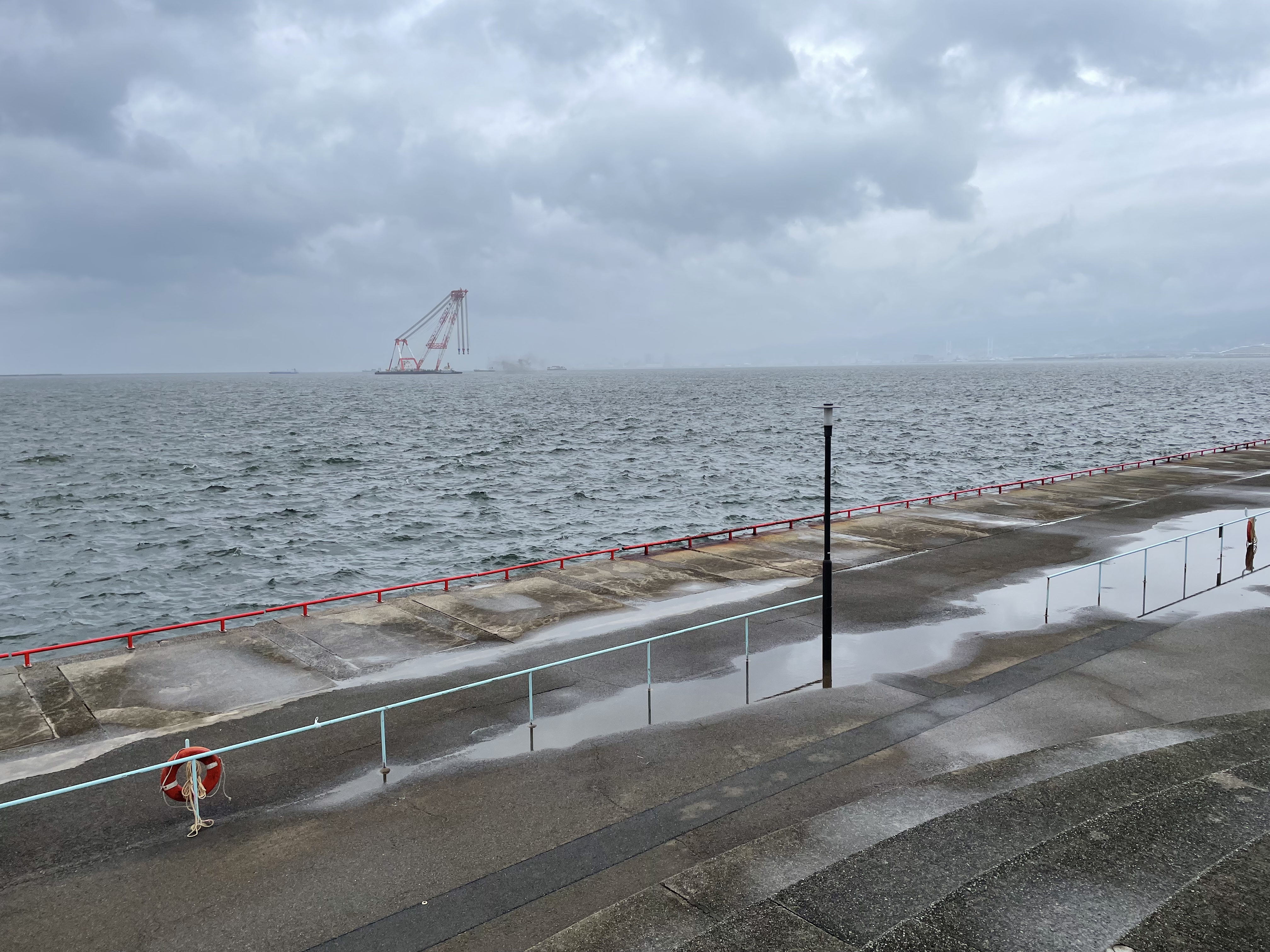 鳴尾浜は大変強い風にともない、波が一部釣り台に打ち上がっています。