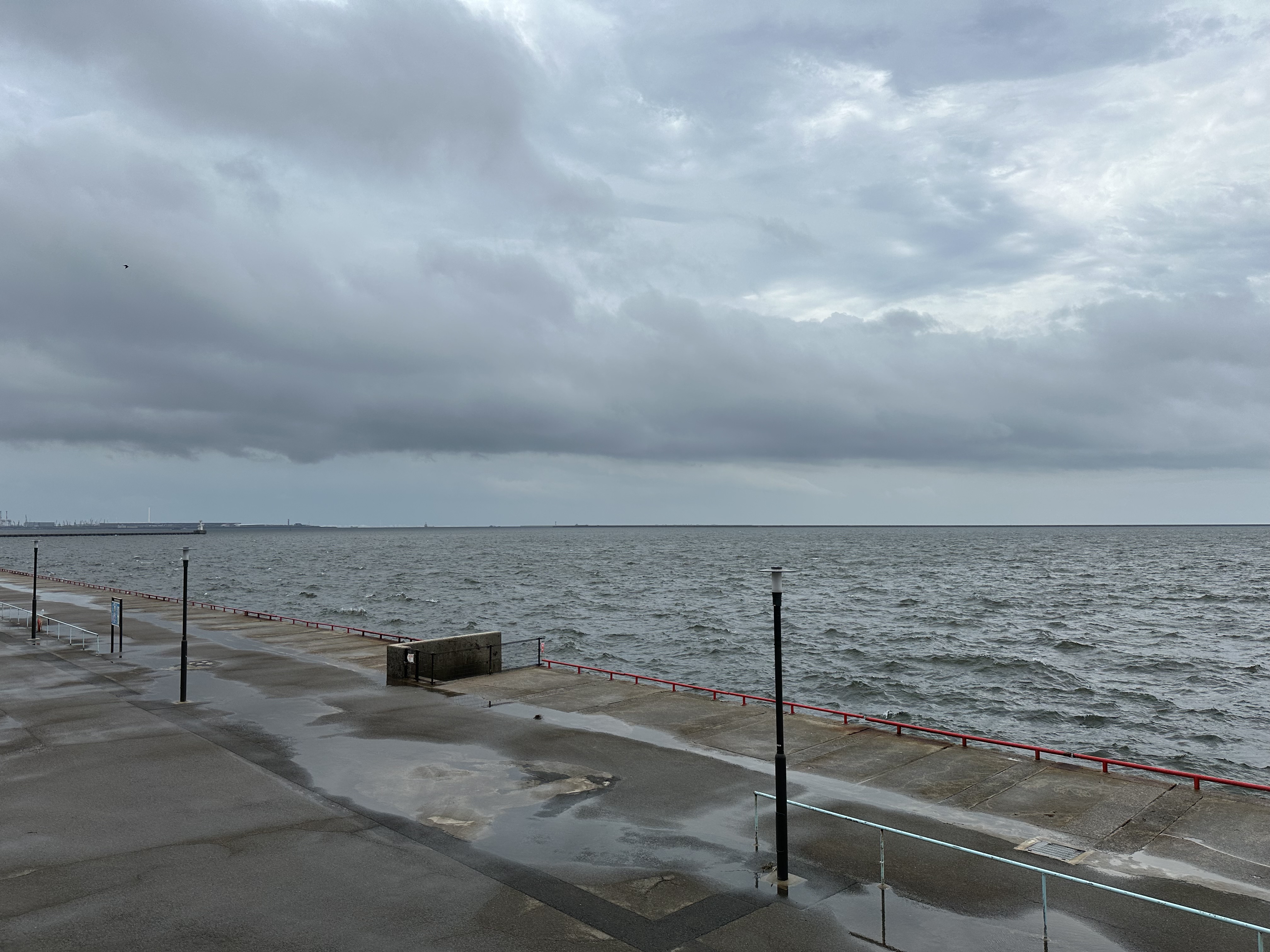 鳴尾浜は13~15mの大変強い風にともない、波が釣り台に打ち上がっています。