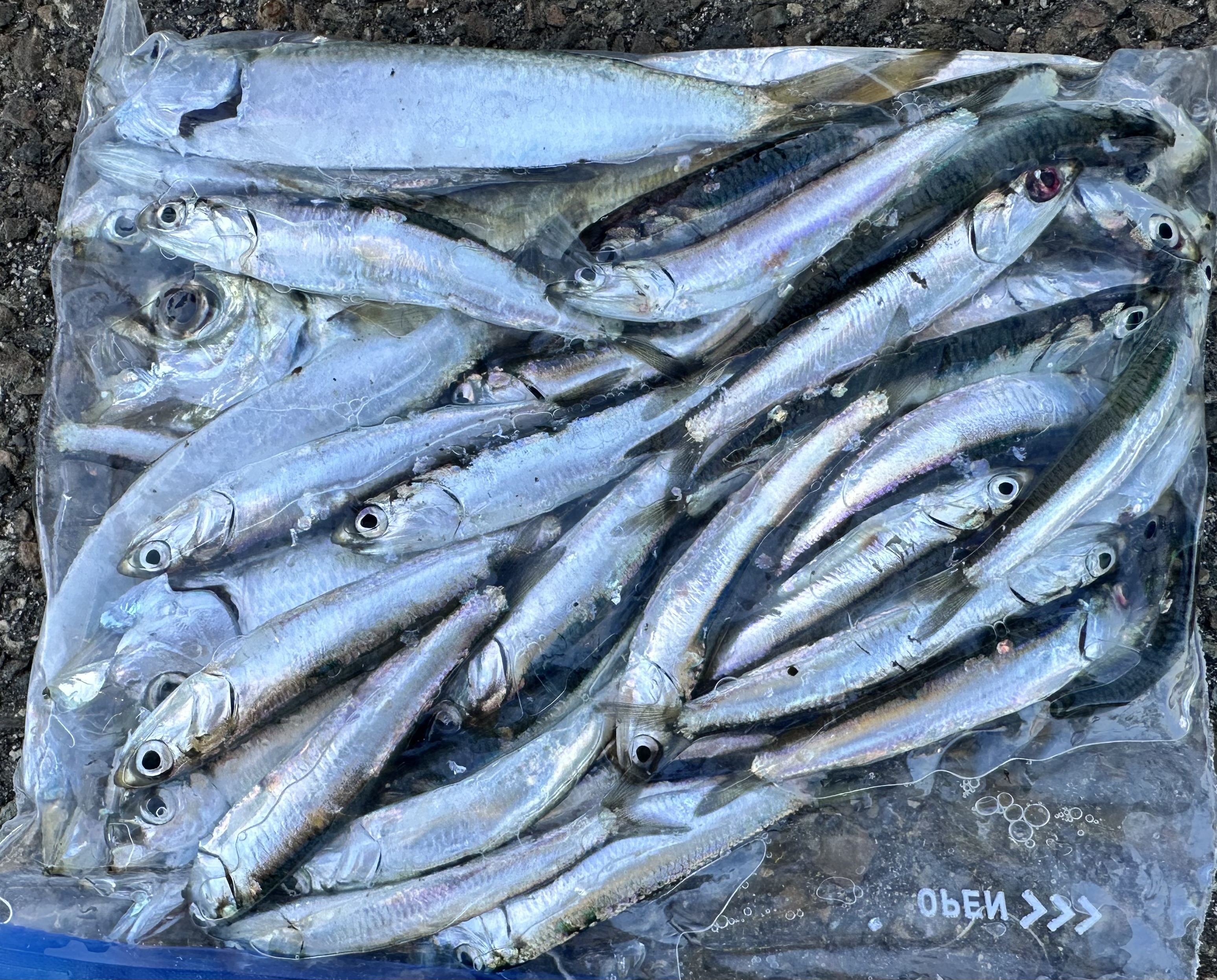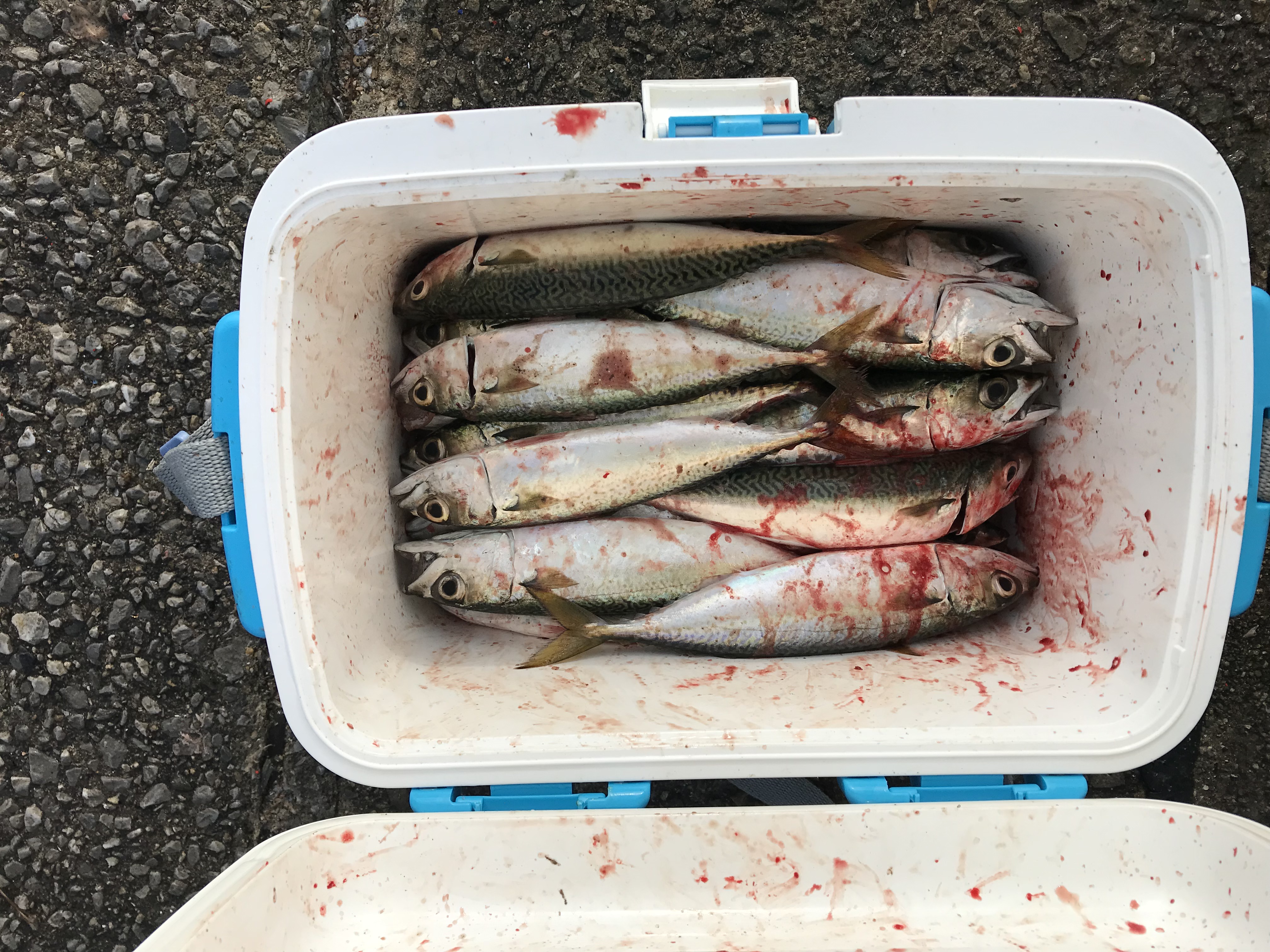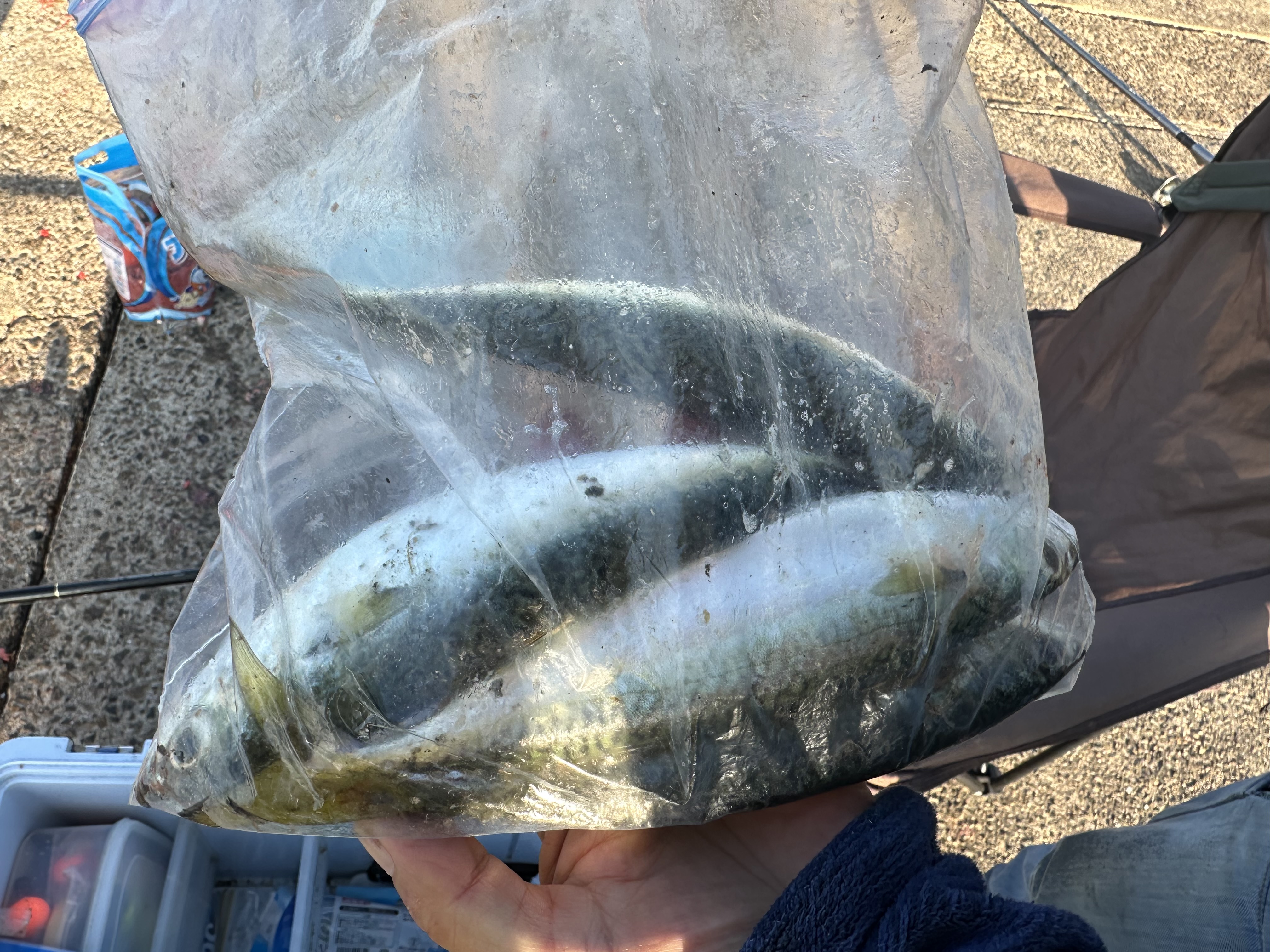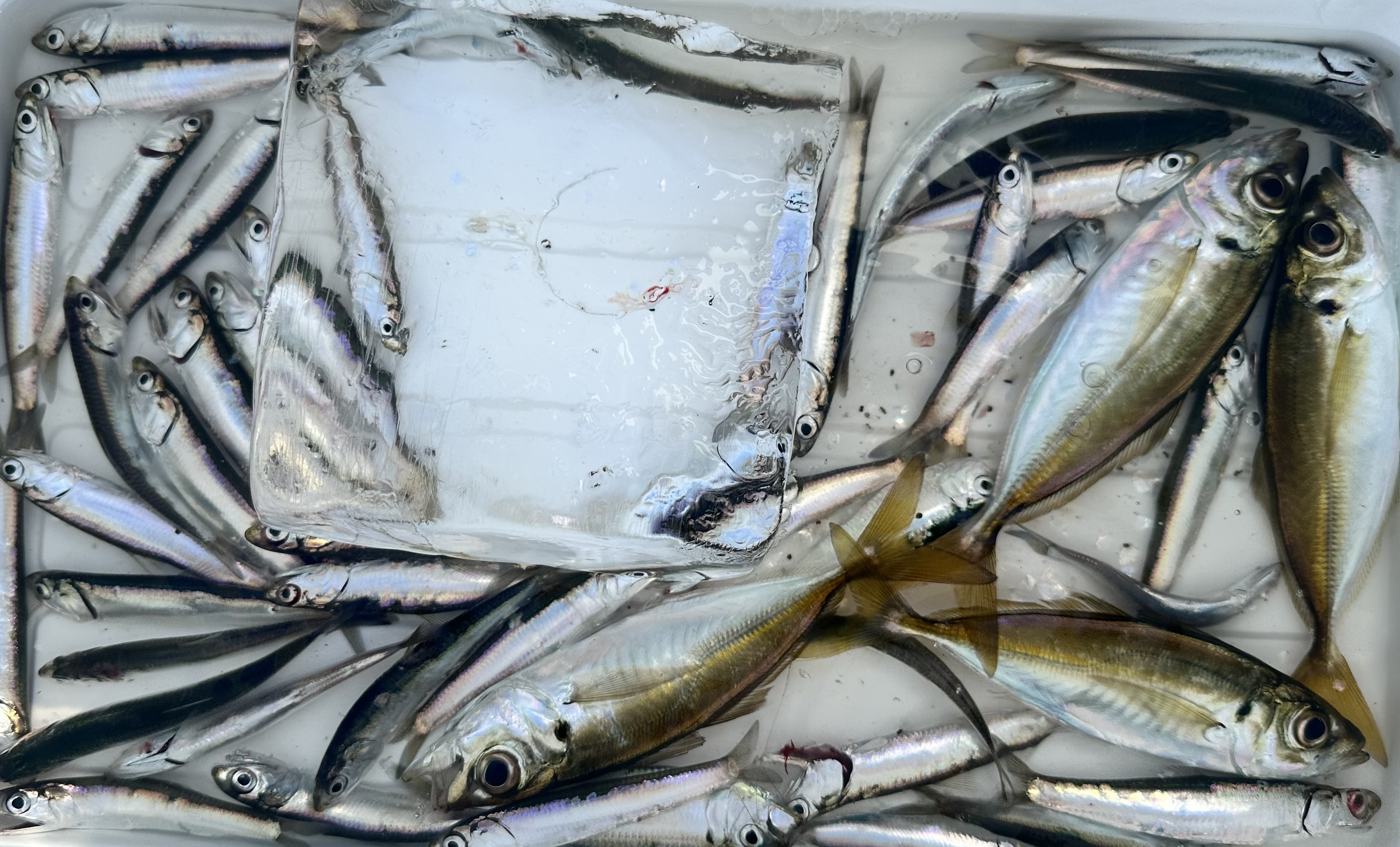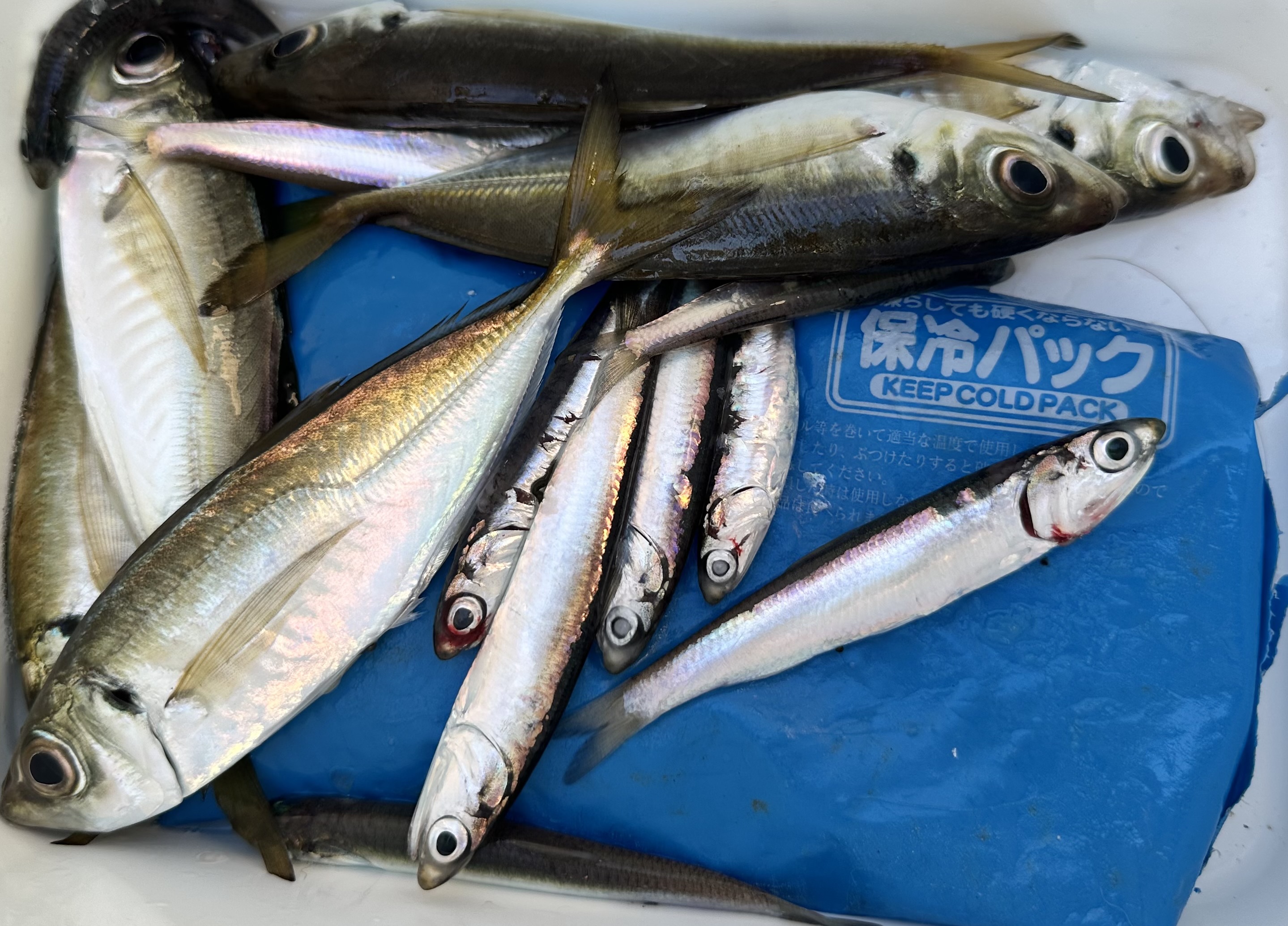 今朝は夜明け前にアジ、カタクチイワシ、少量のサバが釣れていました。カタクチイワシはお昼まで釣れ続けています。