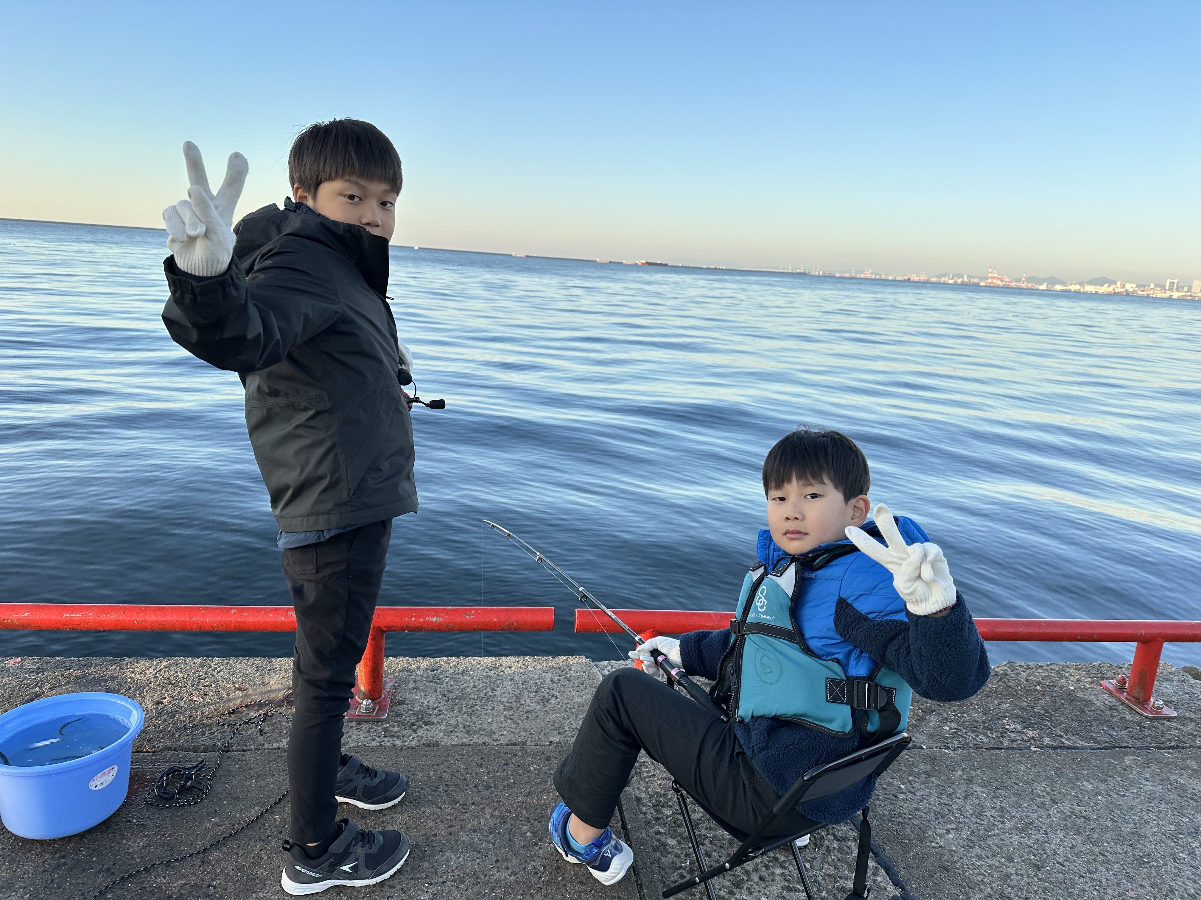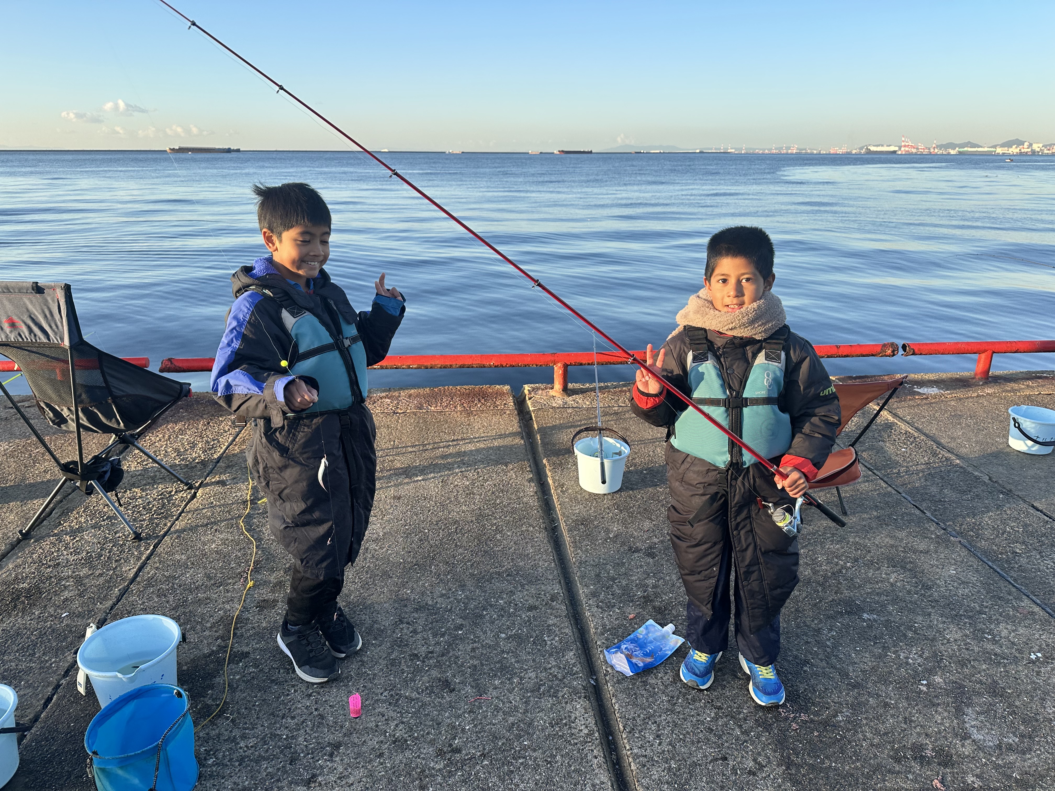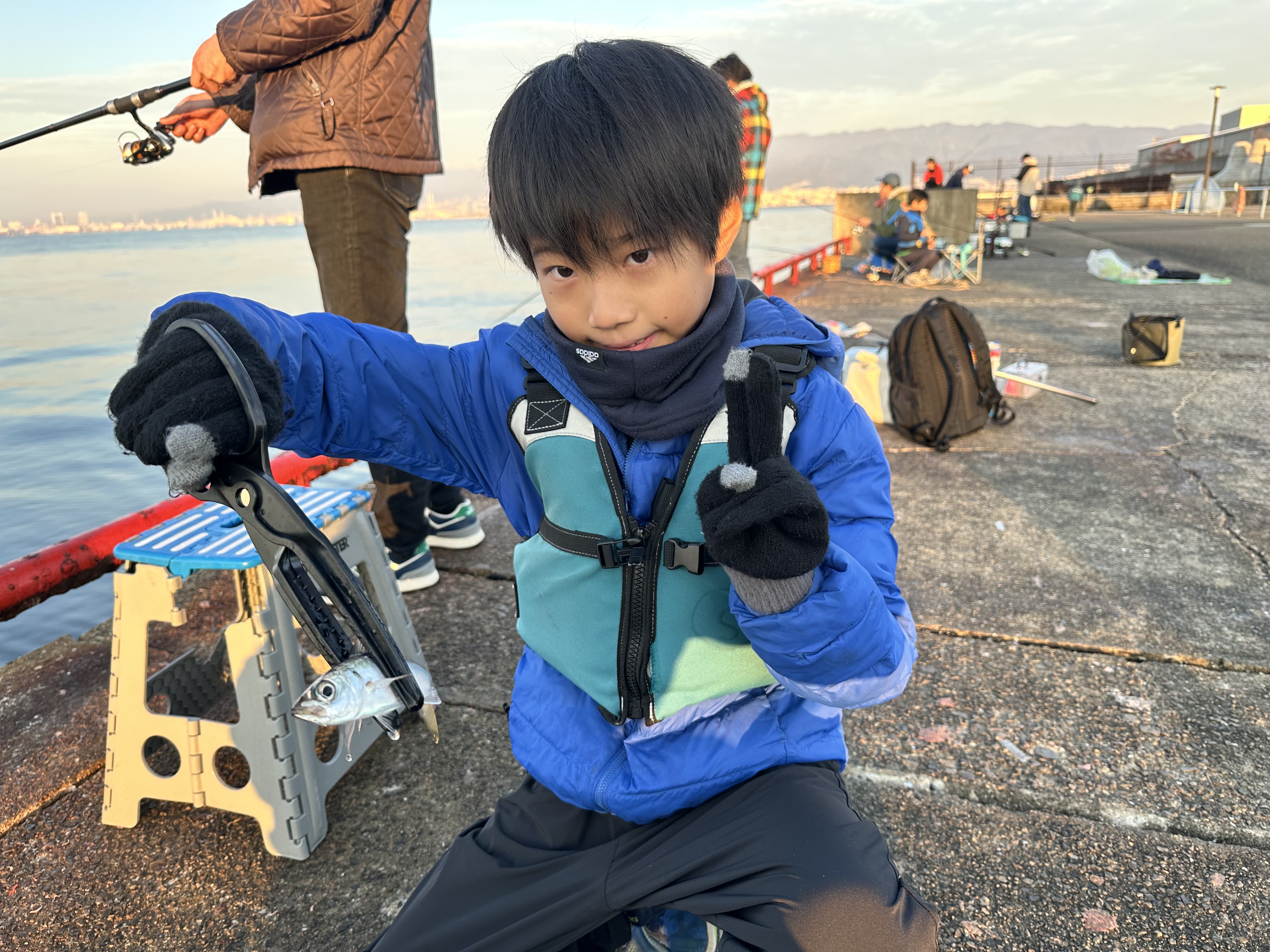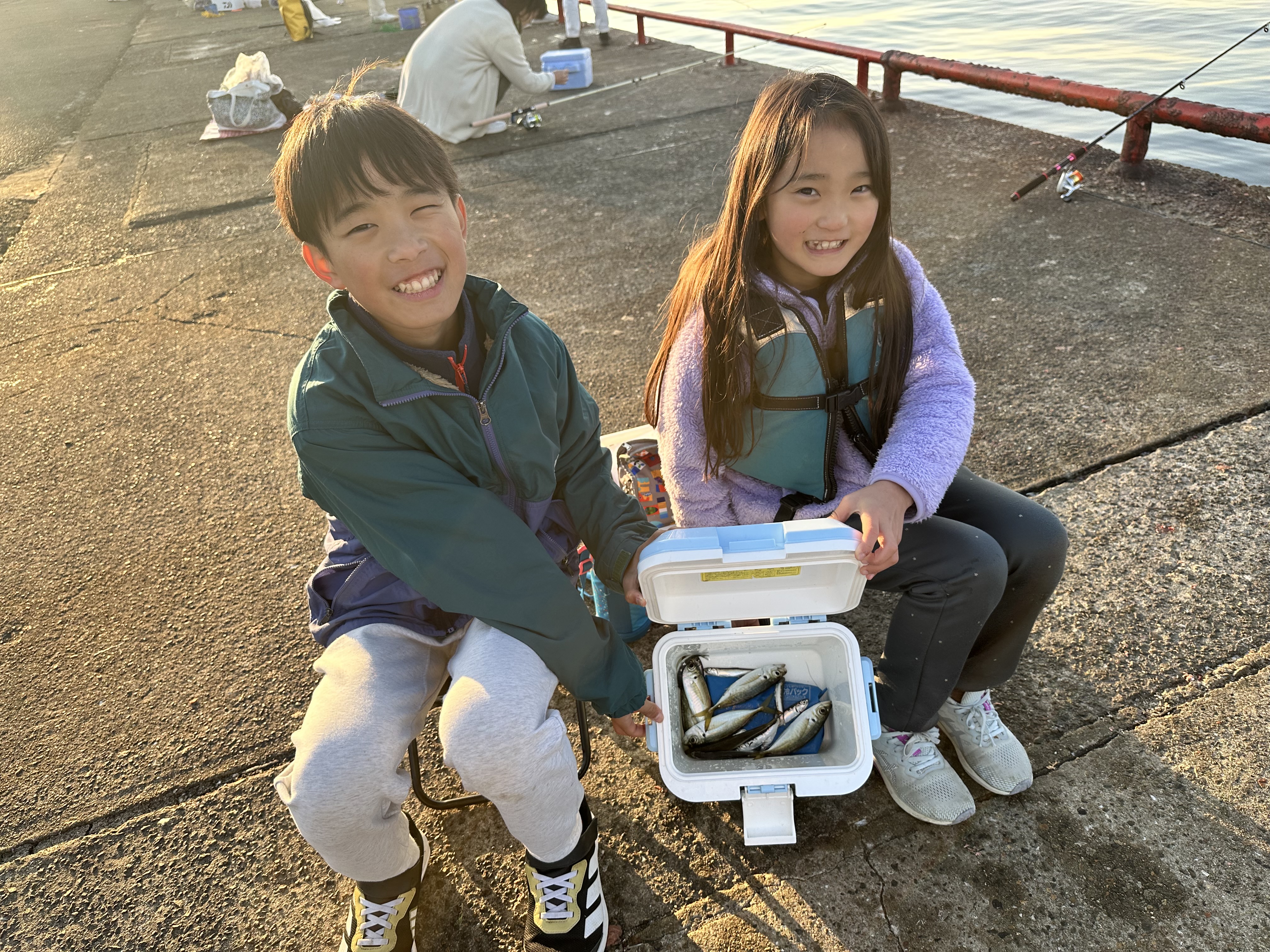 イワシがボツボツですが釣れており、子供さんたちの歓声があがっております。