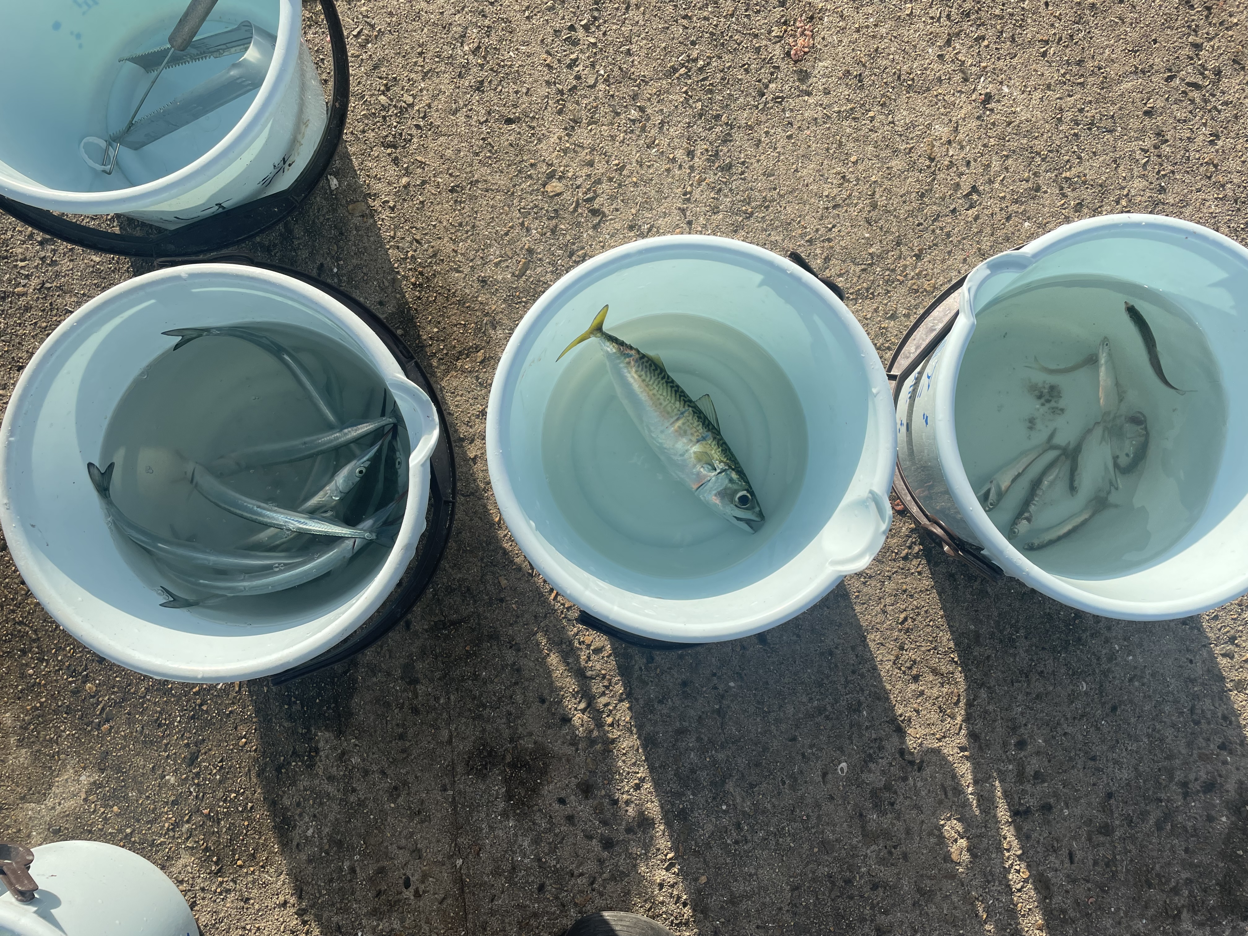 8時現在、サバの群れがたくさん入ってきたようで、足元でサビキ釣りをしている方にも連掛けでサバがかかっております!!!!