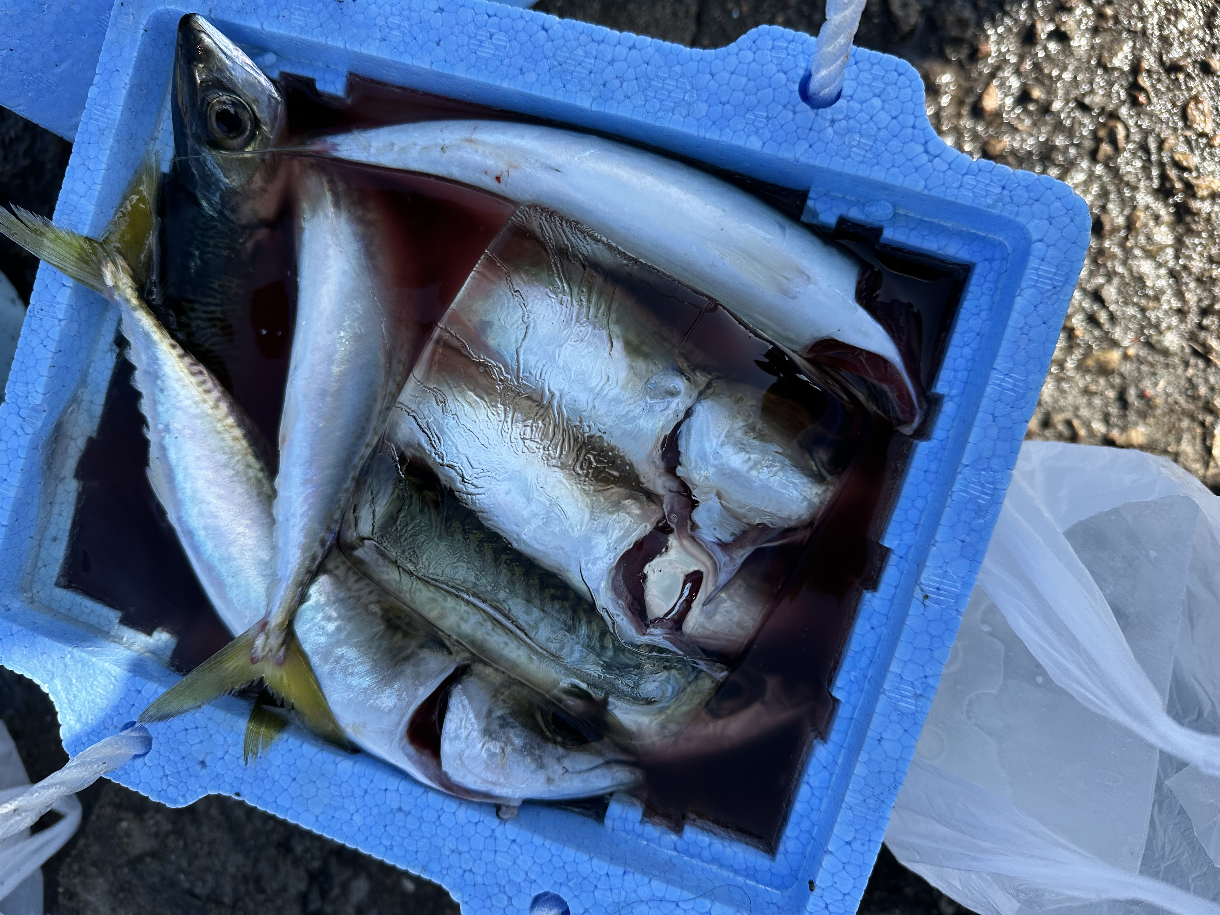 朝一はカタクチイワシの群れがぽつりぽつりと釣れているのと、飛ばしサビキをしている方が少しサバを釣っているぐらいで、今日はきびしいかな・・と思っていましたが・・・!