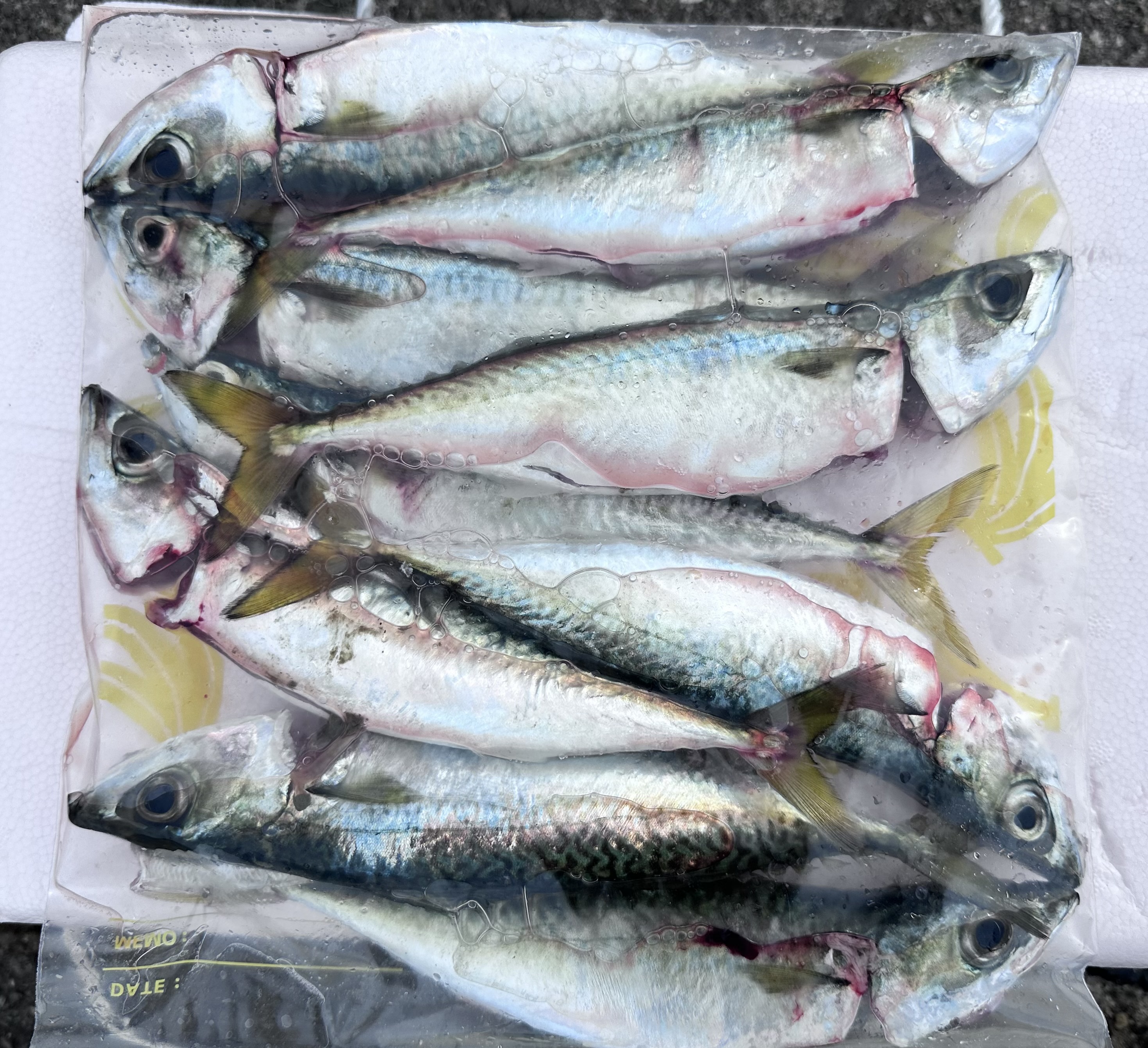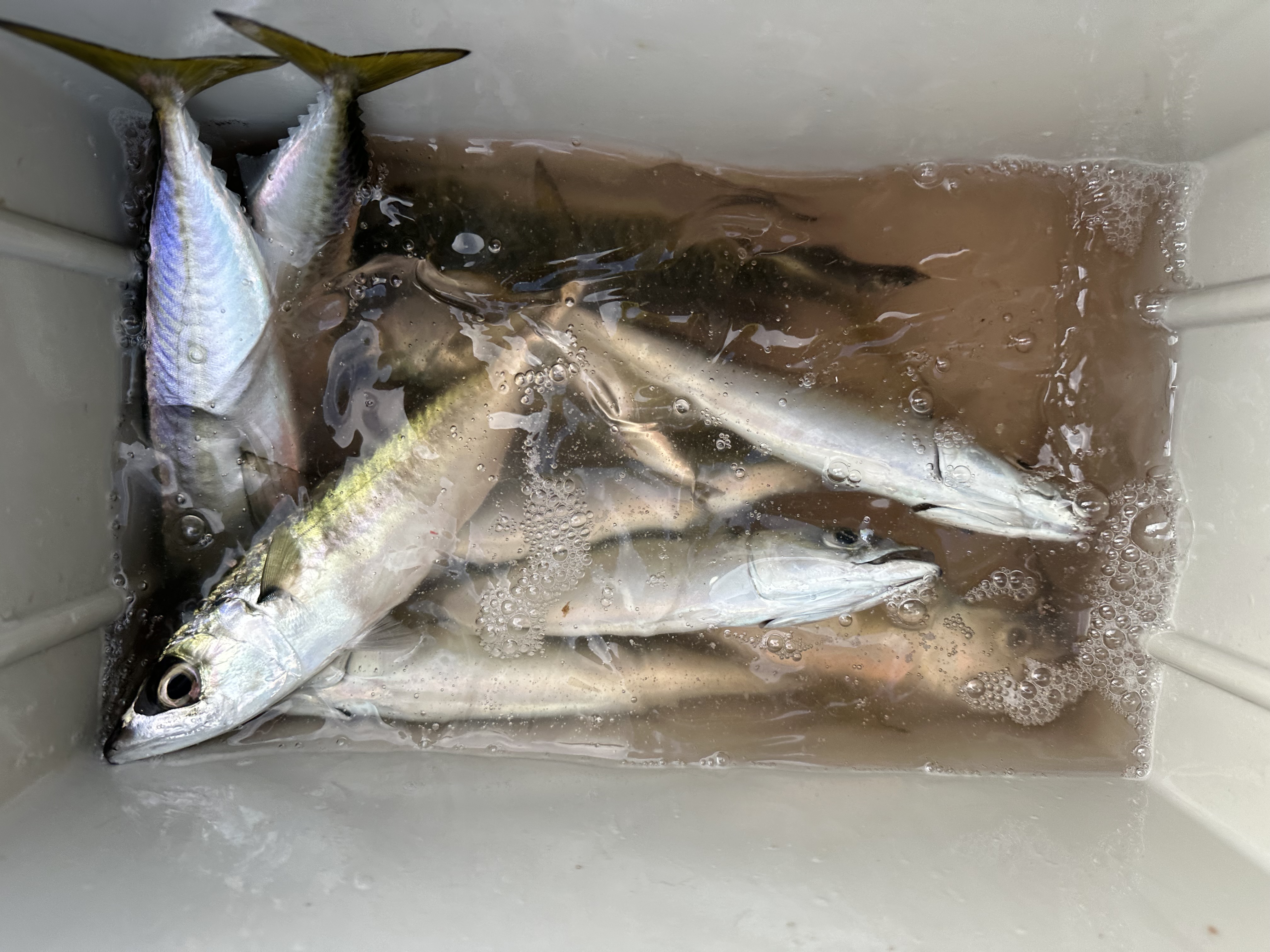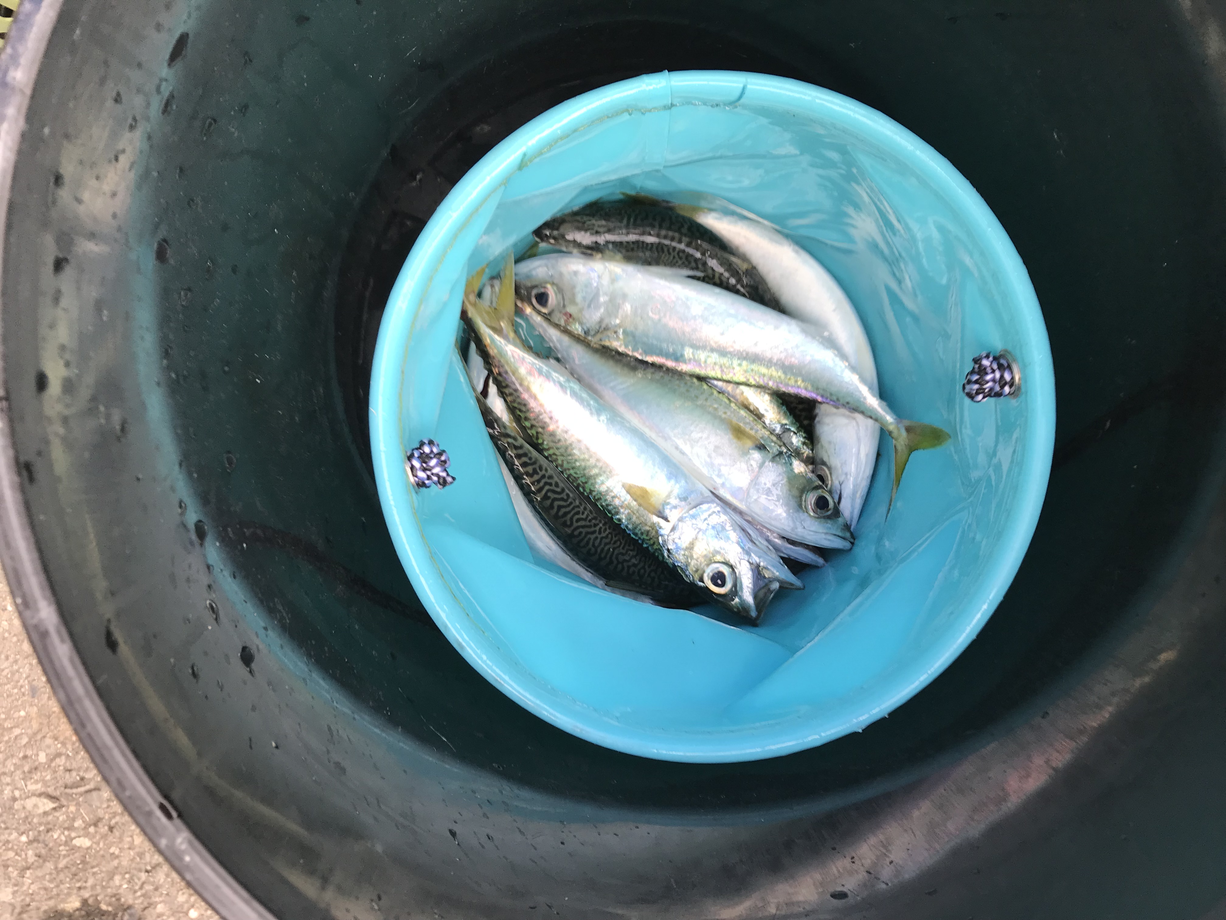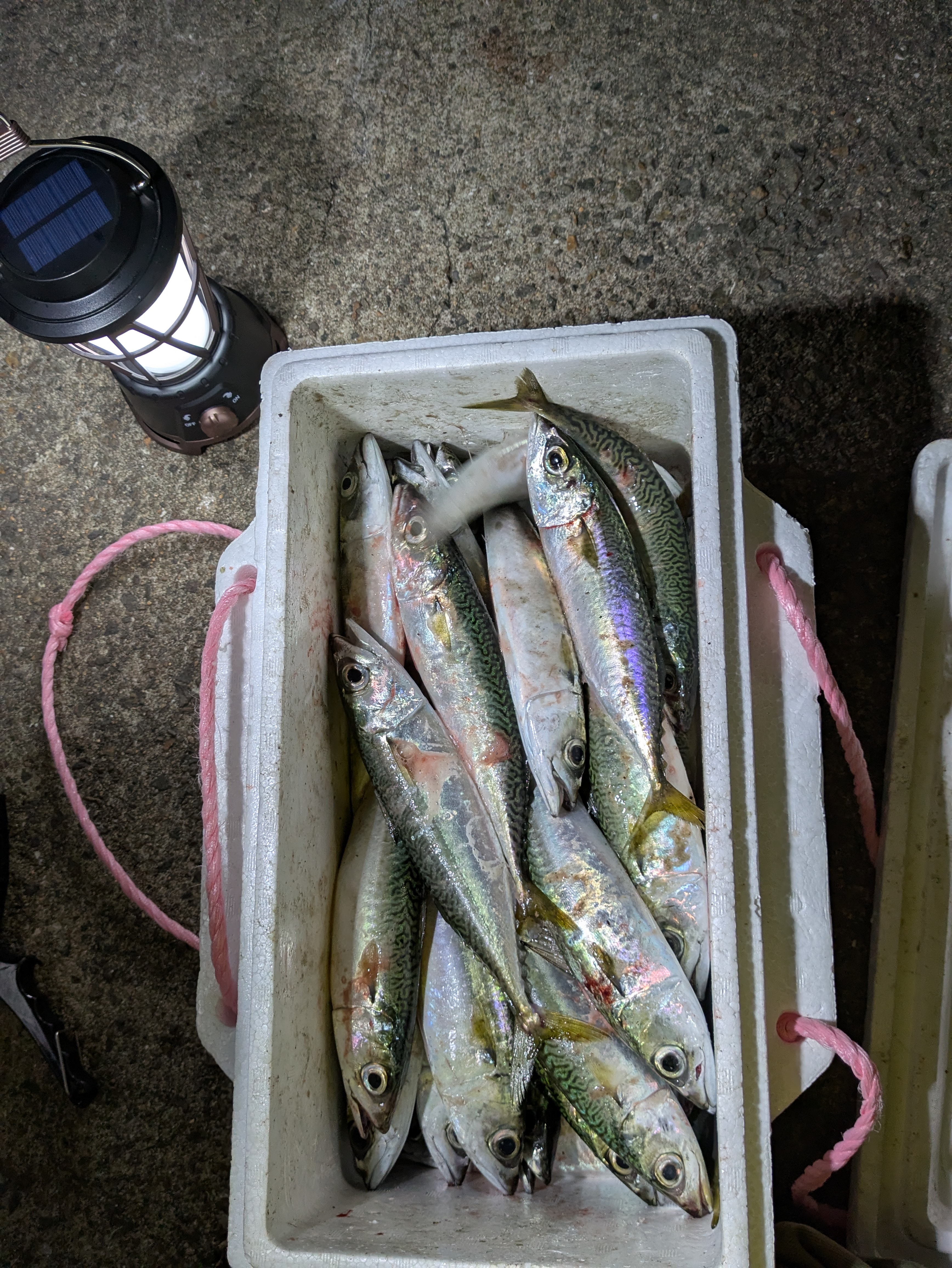 午後からは、サビキ釣りで日中はカタクチイワシ、サッパ(ママカリ)が少し釣れたようですが水温が急に下がったからかサバは姿が見えなかったです。でも日が沈む前にアジが多い方で20匹釣れてましたから、