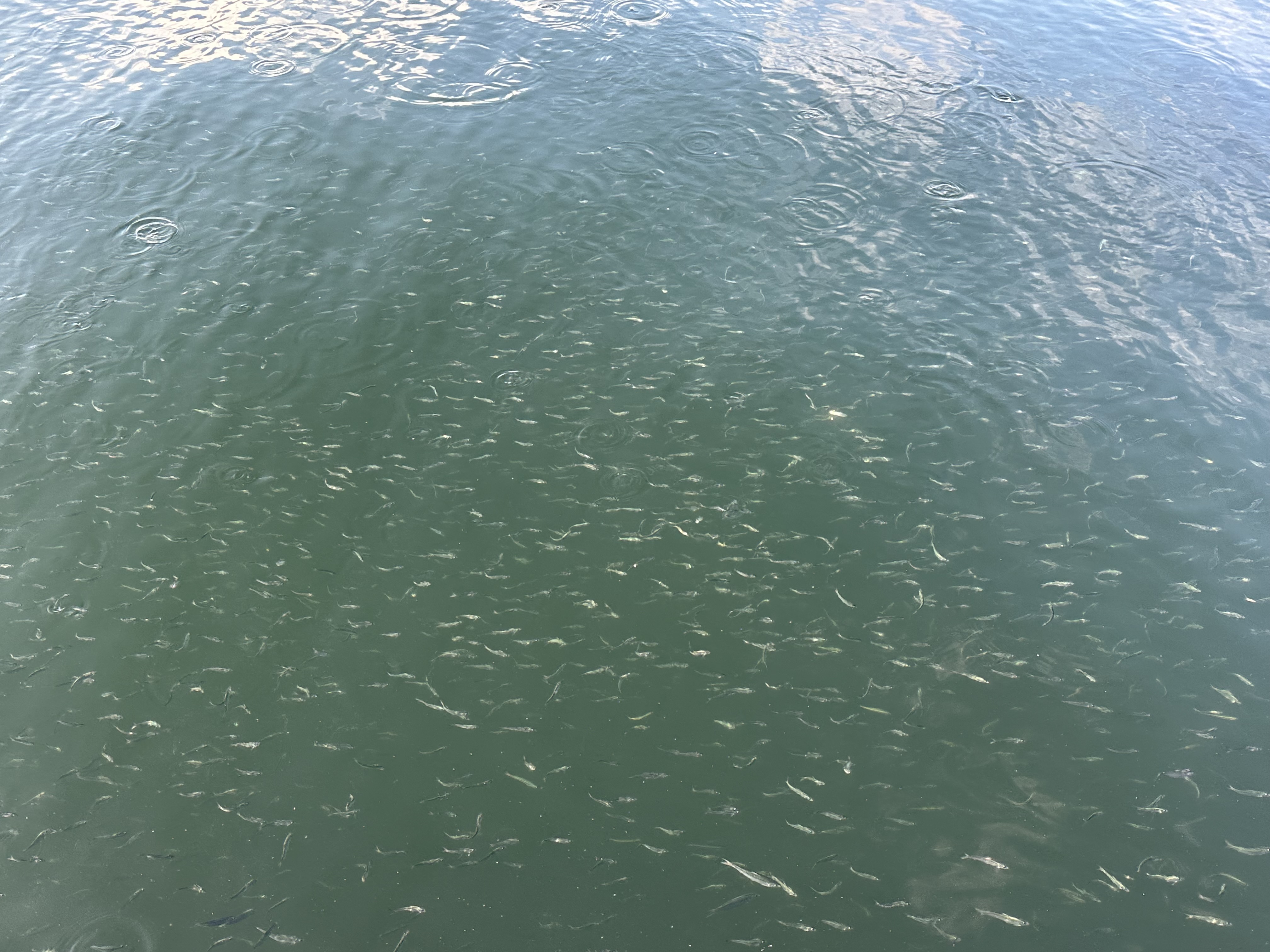 13時、カタクチイワシが少し釣れています。表面にサッパ、カタクチイワシが群れで泳いでますがその下にいるのを狙って下さいね。